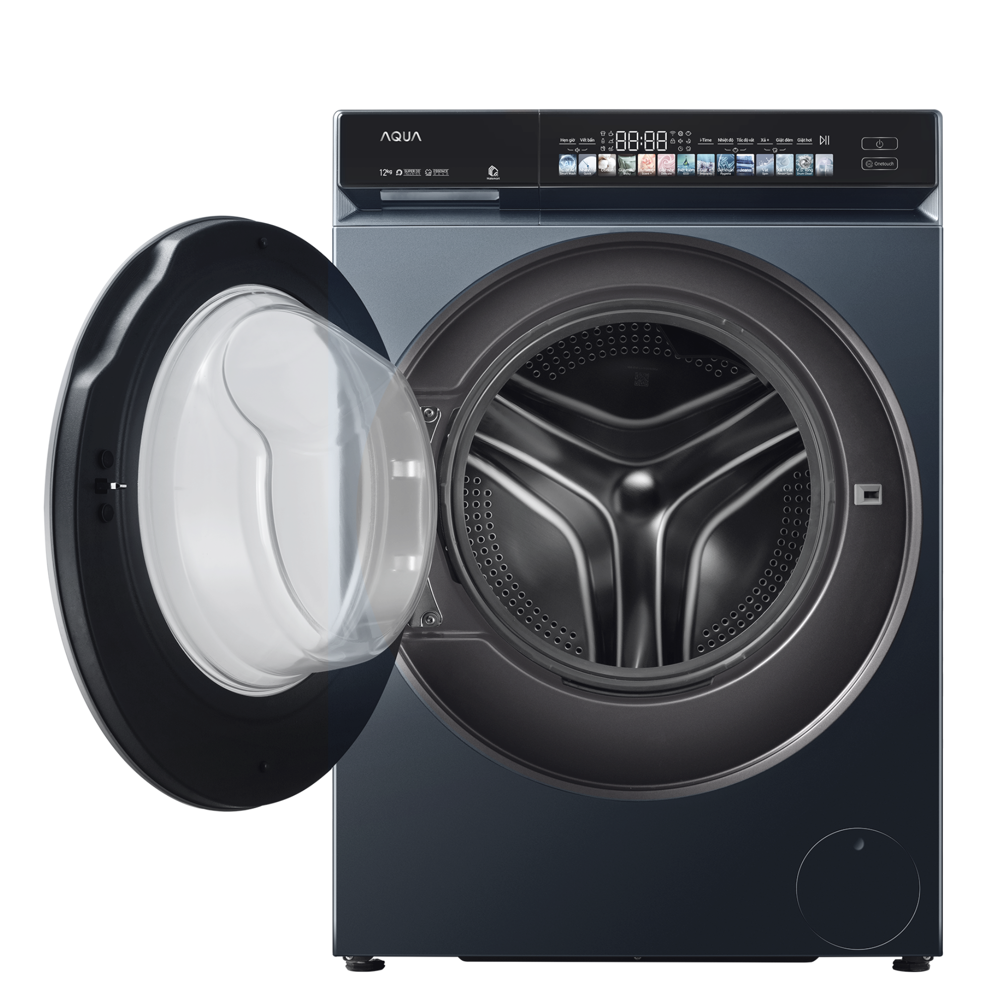Máy giặt Aqua Inverter AW12-B4377U1L(GN) sở hữu thiết kế cửa trước hiện đại với tông màu đen sang trọng, mang đến vẻ đẹp tinh tế cho không gian sống gia đình.